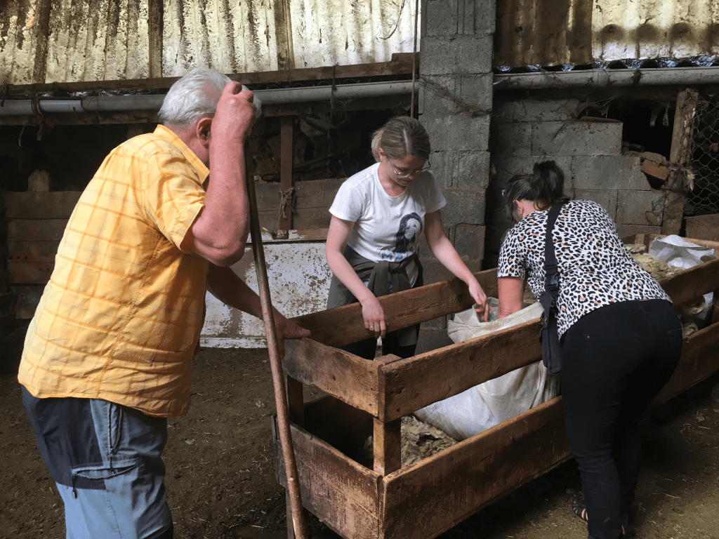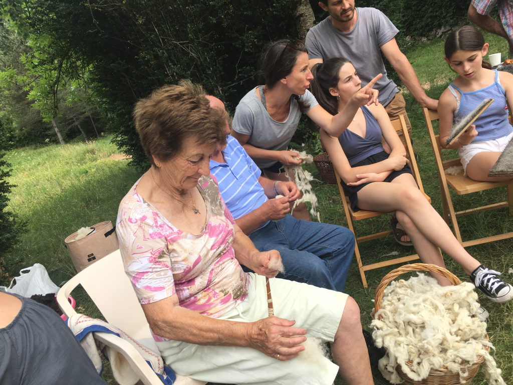 Ta ixugà la llana, antes l’ha esteneban per las parets dels prats, u ensima de las maturradas, pero nusaltras la bem portà tal cubierto de la era de casa de María.