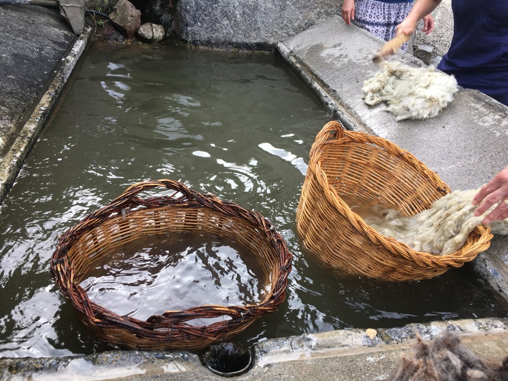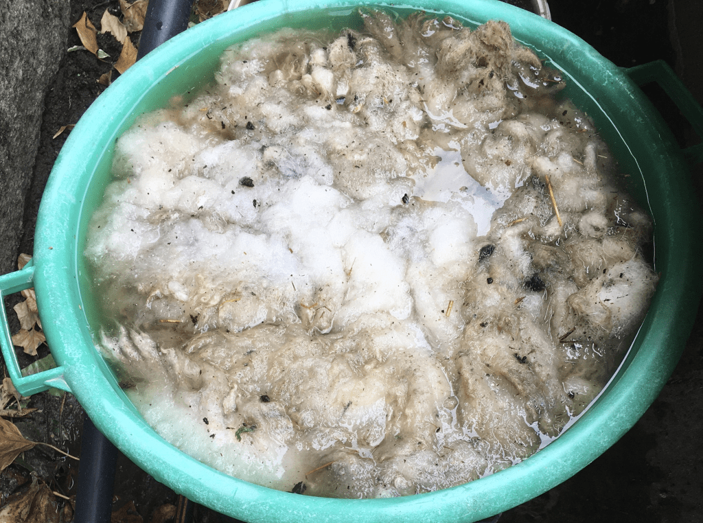 Un parell de vegadas bem anà dan un tocho ta espentià la llana y donala ta baix. Bem escurrí la primera llanada decantan las forradas perque no pensabam empllega-la ta llavà cap de roba mol puerca coma feban antes, ni fe-la bulre ta sacà la lanolina.