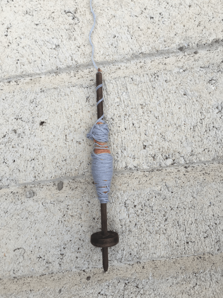 Ye un traste pareseu al fuso, dan una hembrilla a uno dels cabos, ta cola-hi-e las dos vetas de llana que querím torsé.